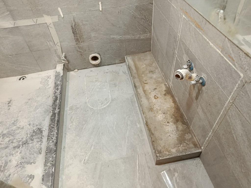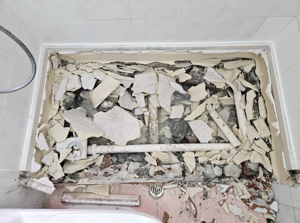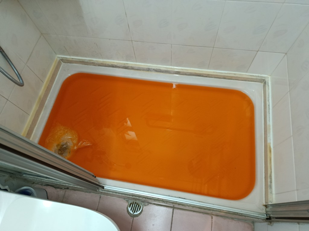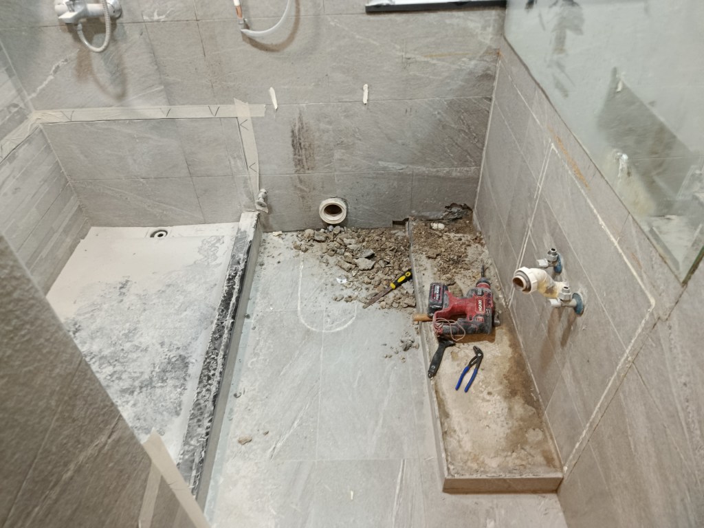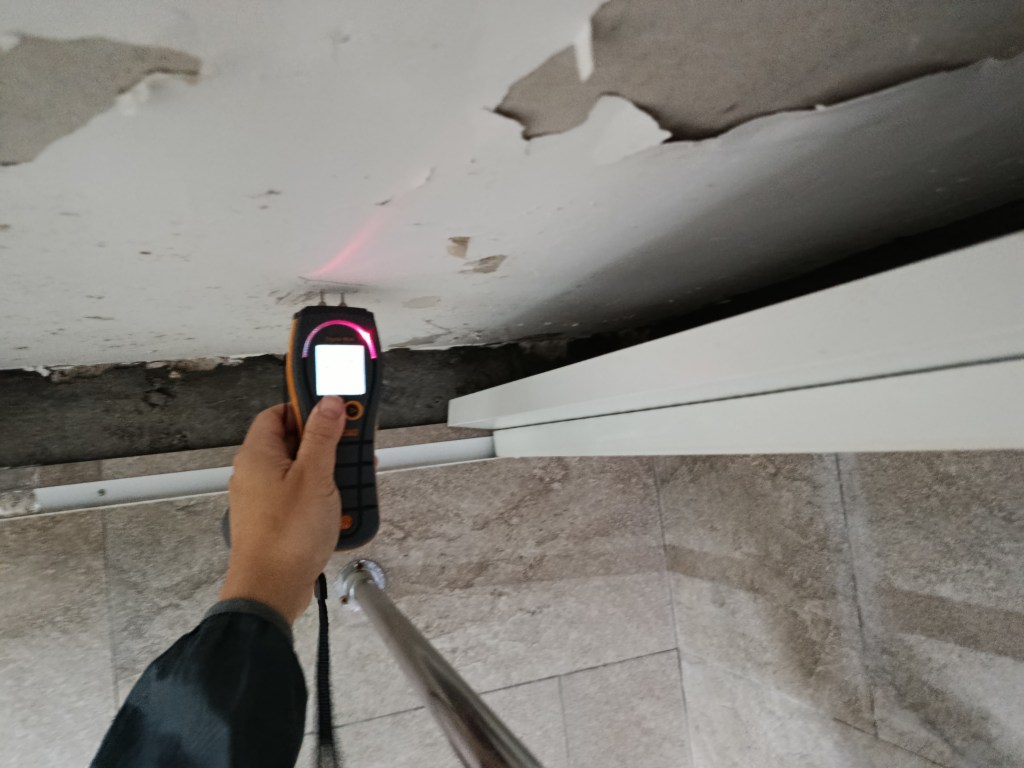 個案(3)- 鴨脷洲上下層滲水1年,下層業主突然邀請上層業主到單位視察,要求上層業主負責支付專家檢測2萬4及維修費用,上層業主要求先檢查先,但下層拒絕俾其師傅/專家入層,2小時上層單位檢測找到地台去水渠滲漏,建議半爆,工期21天。先鑿開地台及半牆壁,找出地台滲水位置,再蒸乾地台2天(<20度),重造過牆地漏,批盪,防水泥2層,鋪瓦及潔具